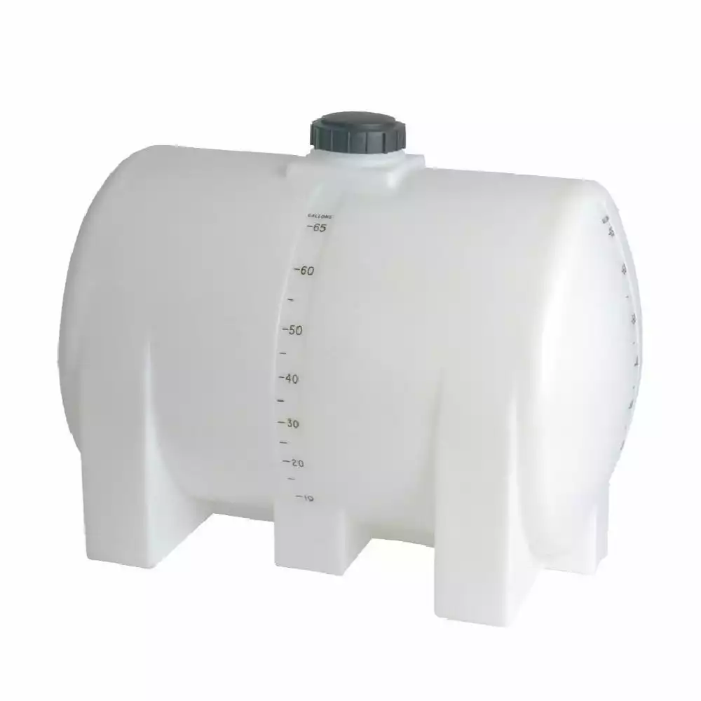 This plastic horizontal leg tank is constructed with rotationally molded polyethylene resin. It’s seamless construction makes it durable and resistant to cracks, chips, and ruptures. The poly tank was made with FDA approved resin that complies with FDA standards 21 CFR 177.1520 (1) 3.1 and 3.2 for the storage of potable water. It’s made with UV inhibitors that help protect liquid contents from direct sunlight – making it ideal for both indoor and outdoor use. This white horizontal tank is transparent for conveniently identifying liquid levels. It has gallon indicators located on the outside of the tank.