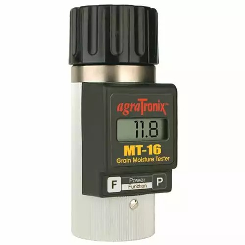 Tired of throwing your harvesting profits down the drain? Controlling moisture in your harvest is one of the most important factors to consider in producing a great quality product. Make the most of each kernel by using the AgraTronix Grain Moisture Tester MT-16. Designed to test over 16 different grains including barley, corn, flax, oats, sunflower (2), wheat (4), canola, rye, soybeans and sorghum with an accuracy of ± 0.5% in normal moisture range. Monitor your quality from start to finish as its designed to use during harvest, drying and grain storage. Easy to use and trusted by the U.S.D.A. Federal Crop Insurance Field Offices. With a weight just over 1 pound, measuring7″ H x 2.5″W x 3″D and comes with a protective case. The AgraTronix Grain Moisture tester can be taken to every destination around your farm and town. It features an adjustable scale comparable to your local elevator, averages up to 99 test readouts, improved overall accuracy results and automatically features a temperature compensation. The MT-16 comes with complete operating instructions, plenty of memory, single push button activation and a bright LCD screen with automatic shut off. Backed by an AgraTronix 24 month limited warranty in North America and 12 month limited warranty outside North America.