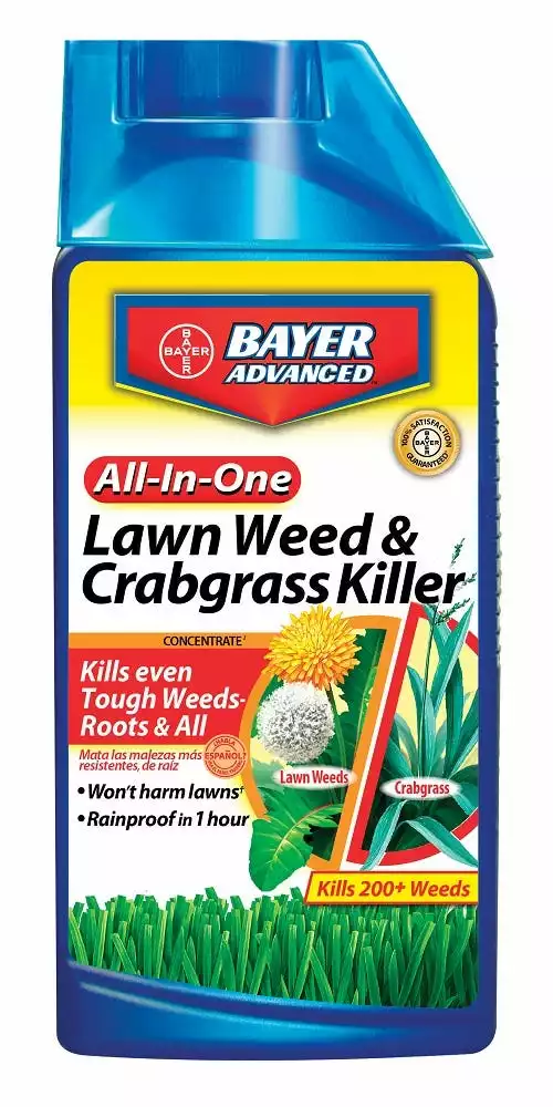 Bayer Advanced All-in-One Lawn Weed and Crabgrass Killer Concentrate kills lawn weeds plus crabgrass in one easy step. The rainproof formula kills tough weeds and won’t harm your lawn when used as directed. Controlling lawn weeds plus crabgrass in your lawn has never been easier.