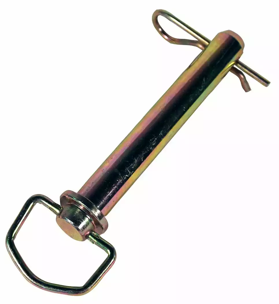 - 1″ X 6 1/4″Forged head hitch pin with swivel handle and zinc plated “R” clip pin