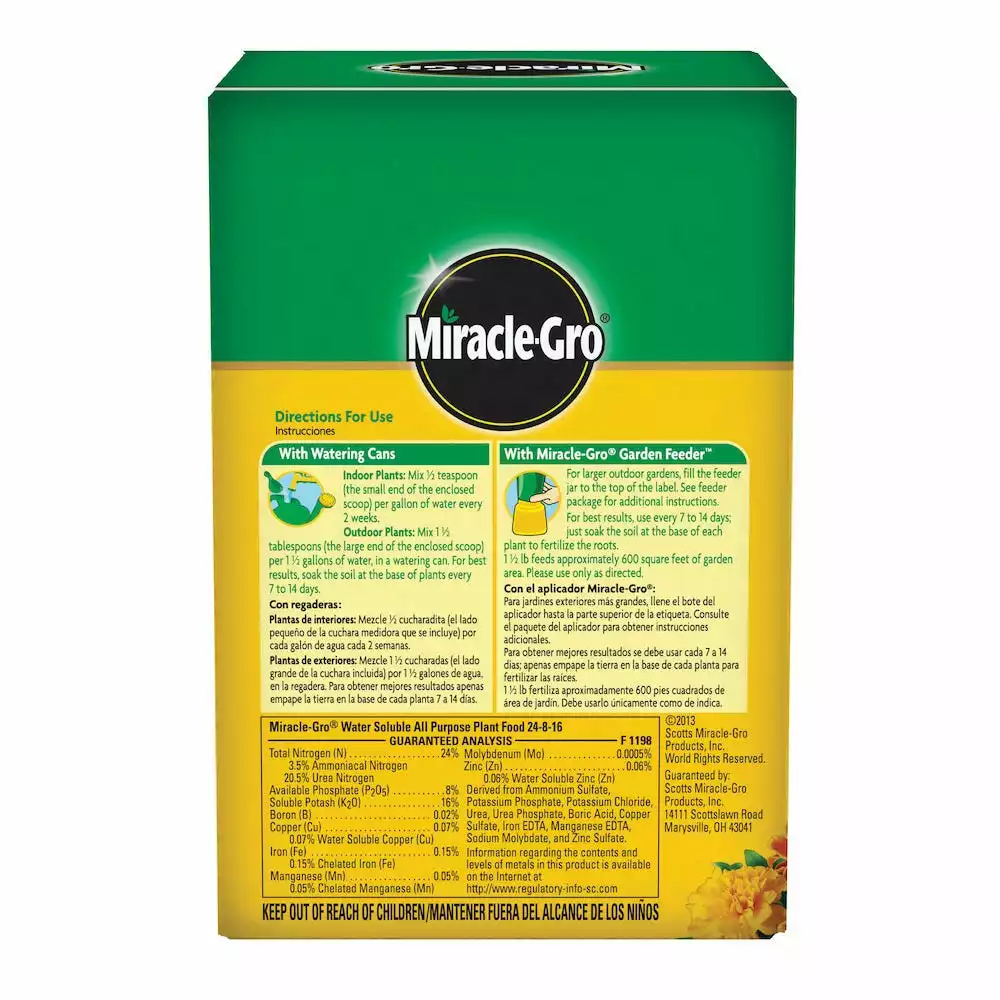 Miracle-Gro Water Soluble All Purpose Plant Food instantly feeds vegetables, trees, shrubs, and houseplants to grow bigger and more beautiful than unfed plants. Simply feed them every 1-2 weeks. The formula is safe for all plants, and is guaranteed not to burn when used as directed. Get beautiful results with Miracle-Gro.