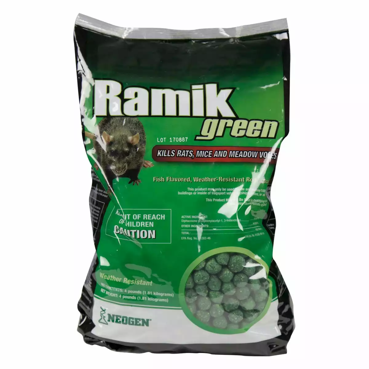 Nuggets are hot-extruded so they are weather-resistant without the use of wax. Diphacinone, the active ingredient in Ramik®, is a first generation anticoagulant and is made from a food-quality grain mix. It comes in various forms and package sizes suitable for any use, from rat infestations encountered in livestock and poultry production facilities to the occasional mouse in the house.
