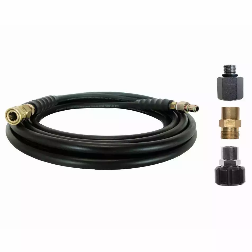 Get more done with the Valley Industries Universal 3,600 PSI, 25 Feet Pressure Washer Hose. This heavy-duty hose is designed to tackle a variety of pressure washer application for residential and commercial washing such as washing cars, floors, motorcycles, windows, siding, driveways, and roofs. Featuring 3/8” quick connect female socket and 3/8” plug for easy connections to pressure washer accessories. Reinforced with steel wire to provide extra durability, while being cut and burn resistant. Comes standard with 25 feet of length to provide extra slack for the hard to reach power washing applications. Ideal for pressure washers that reach up to 140° F and 3,600 PSI. Includes bonus fittings: ¼” MBSPP x 3/8” FNPT adapter, M22 x 3/8” FNPT socket and M22 x 3/8” FNPT adapter. Hose diameter 5/16”.