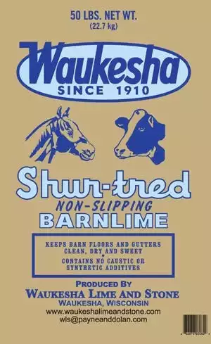 Waukesha Shur-tred Barn Lime keeps animal pens, barn floors and gutters clean, dry and sweet smelling. Lime also neutralizes soil acid; use it wherever you want to strengthen your soil and increase fertilizer efficiency. Shur-tred non-slipping stall lime in a 50 lb bag, produced by Waukesha Lime and Stone, has been a staple of the Wisconsin Dairy Industry since 1910.